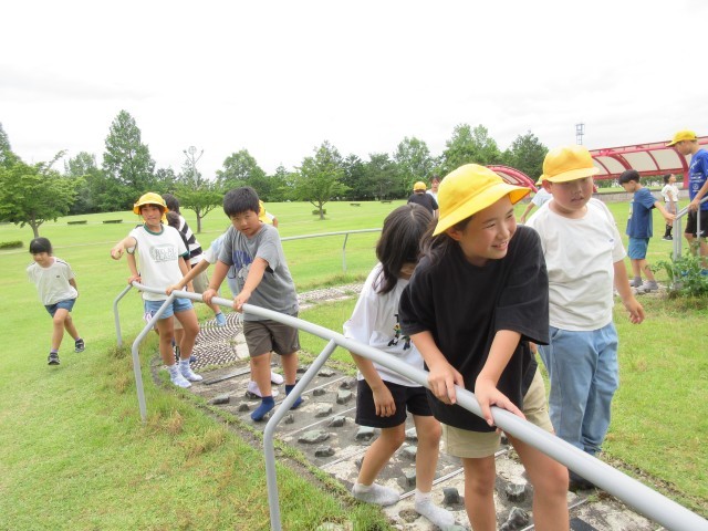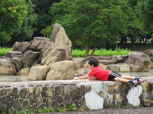 イタイイタイ病資料館にある広場で、鬼ごっこをしたり、足裏を刺激するところを靴下で歩いたり、池のほとりでリラックスしたりと、楽しく過ごしました。