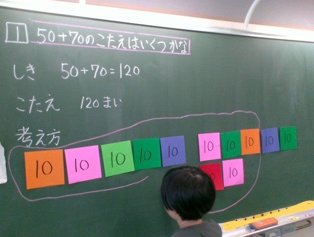 算数科では、何十、何百の計算に取り組みました。前回の学習で学んだ「10が10こで100になること」を使って計算の仕方を説明したり、10のまとまりがいくつ分で考えて「0を隠して計算するとわかりやすい」ことに気づいたりしました。