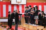今年度の修了式は、感染予防のために代表の子供たちが体育館に集まり、修了証が授与...
