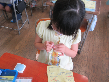 家庭科の学習では、初めての裁縫に挑戦しています。初めはなかなか糸を通すことがで...