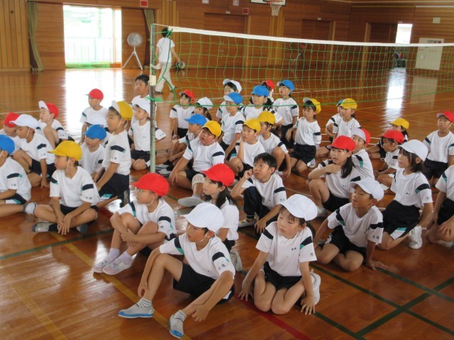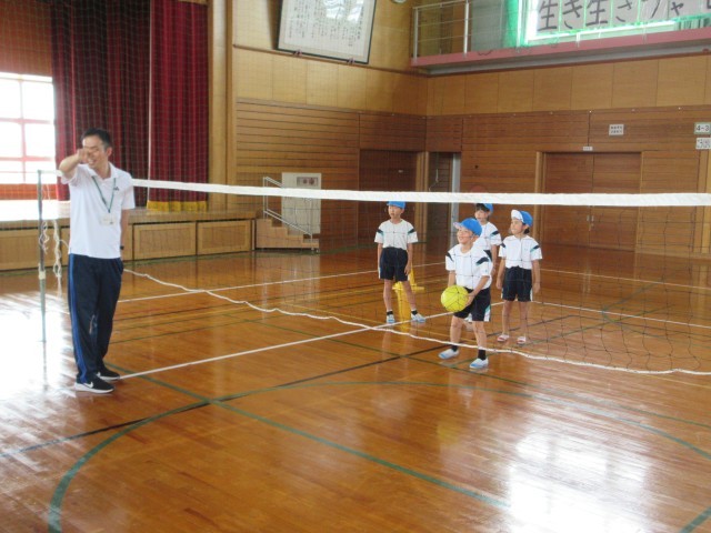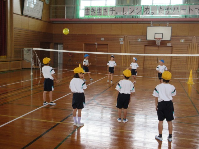 キャッチバレーボールの試しのゲームを行いました。チームの仲間とパスをつないで、相手コートにボールを返しましょう。