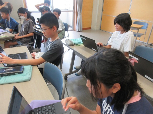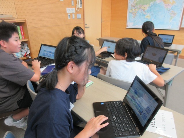 夏休みの出来事についてスライドにまとめた英語日記を見合いました。