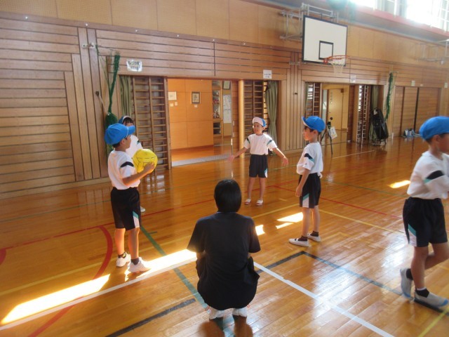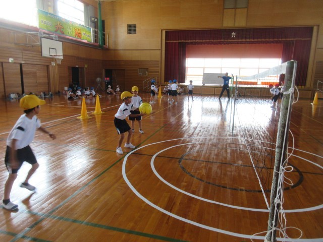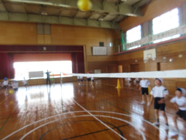 始めに、「いち」「に」「さん」と声をかけてボールをつなぎ、相手コートに返球する練習をしました。その後のためしの試合では、練習を生かして楽しくゲームをする様子が見られました。