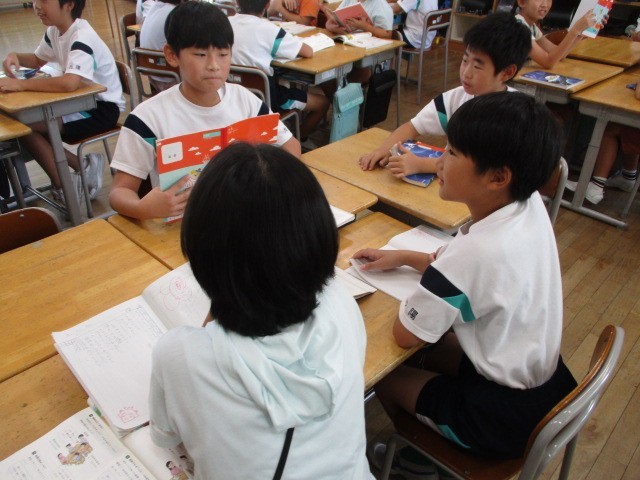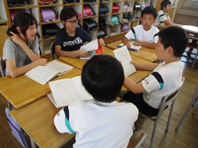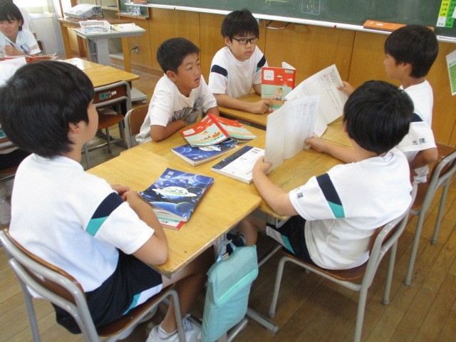 旅行先として「海をすすめるチーム」「山をすすめるチーム」という立場に分かれて対話の練習をしました。質問し合い、考えのちがいを明確にすることの大切さに気付きました。