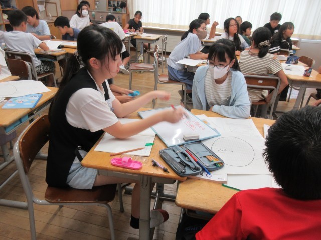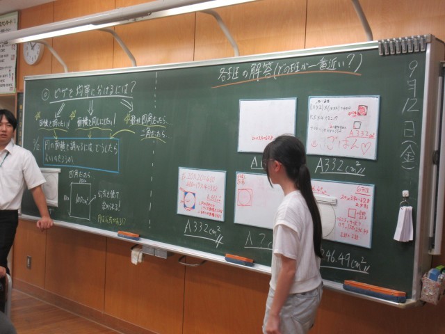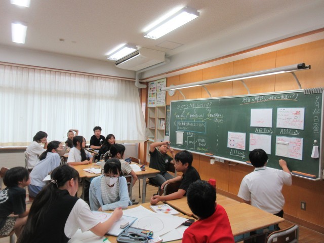 グループに分かれて、ピザを均等に分ける方法を考えました。これまで学習したことを生かして、自分たちの考えを練り上げる姿が見られました。