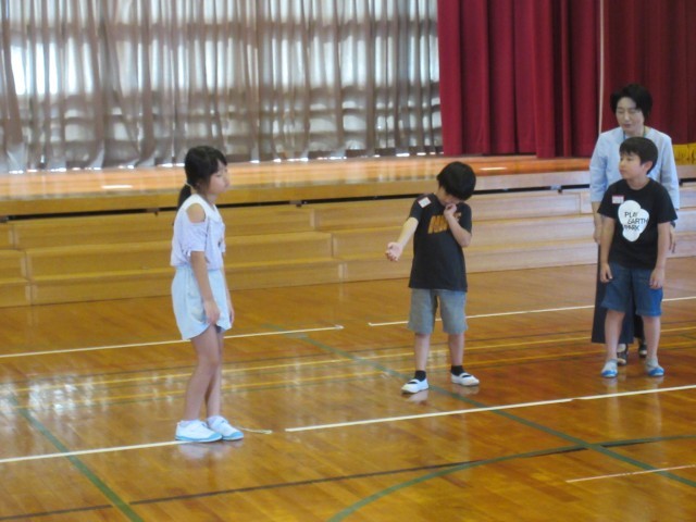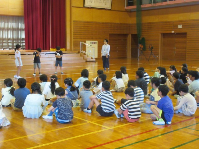 体育館での練習の様子です。子供たちは、声の調子を変えたり動きを付けたりと、役になりきって演じていました。どんな劇になるのかとても楽しみです。