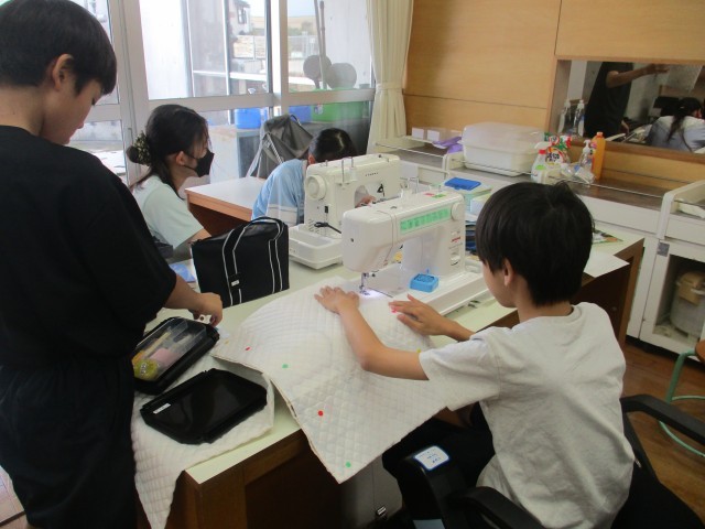 家庭科の時間では、トートバッグをつくっています。5年生で学習したミシンの使い方を思い出しながら取り組んでいます。さすが6年生。まっすぐに布を縫い合わせていました。