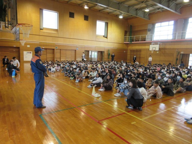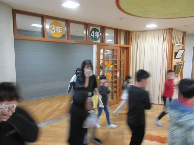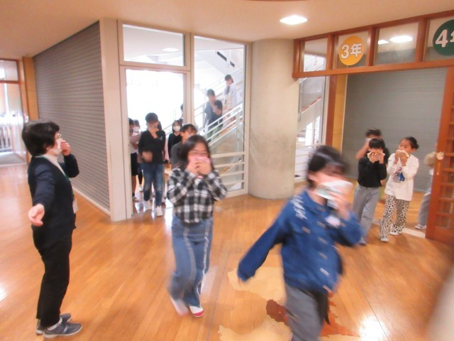 給食室から出火という想定で避難訓練を行いました。今日の訓練では、防火シャッターが閉じている箇所を安全に通り抜けるということも練習しました。