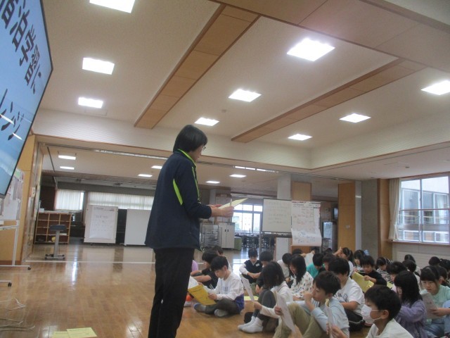 宿泊学習に向けてしおりの読み合わせをしました。様々な活動を楽しみにする様子です。