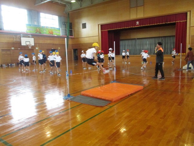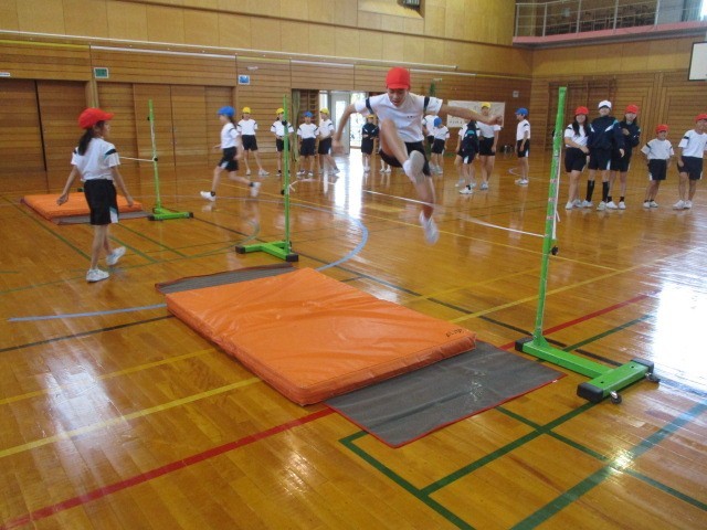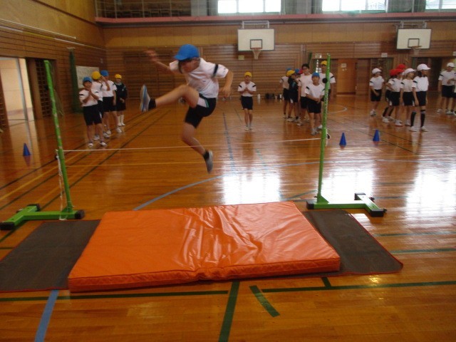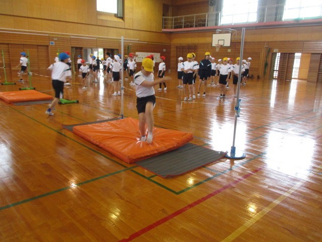 体育科の学習で、走り高跳びに取り組んでいます。踏み切り足や振り上げ足をたしかめました。