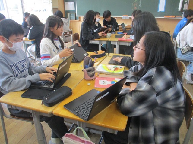 一人一人が1年生としたらよい遊びを考え、スライドにまとめました。まとめた考えをペアの人に伝えています。