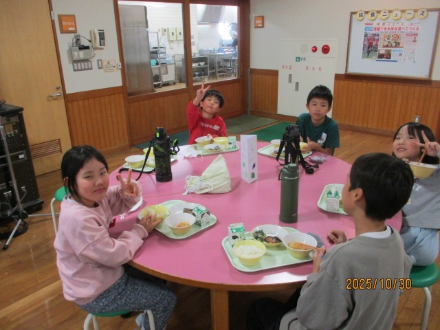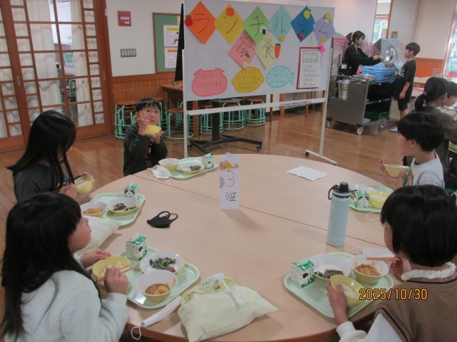 2年2組と5年1組でランチルーム会食を行いました。5年生のみんなに優しく話しかけてもらったり、給食委員会のクイズをしたりと楽しい時間になりました。