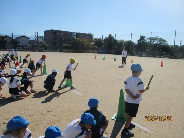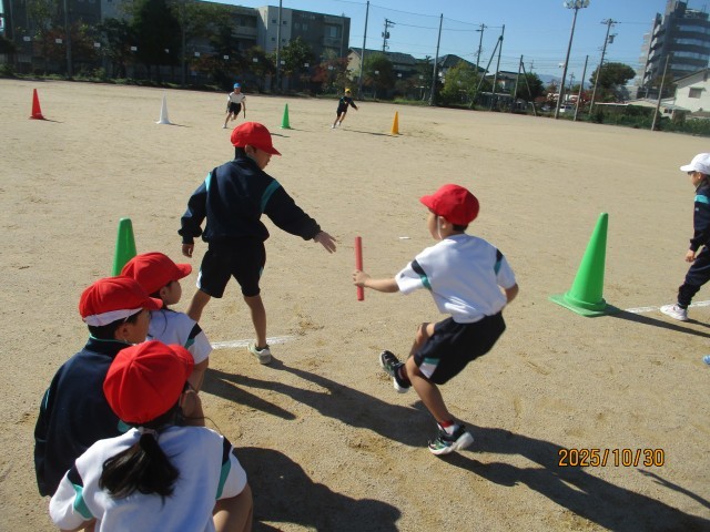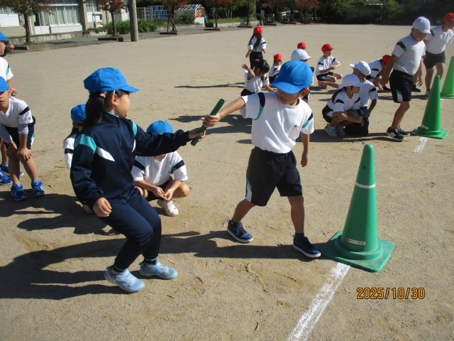 体育の学習でバトンパスの練習をしています。繰り返し練習をして、だんだん上手になってきた子供たち。今日は、団対抗ミニリレーを楽しみました。