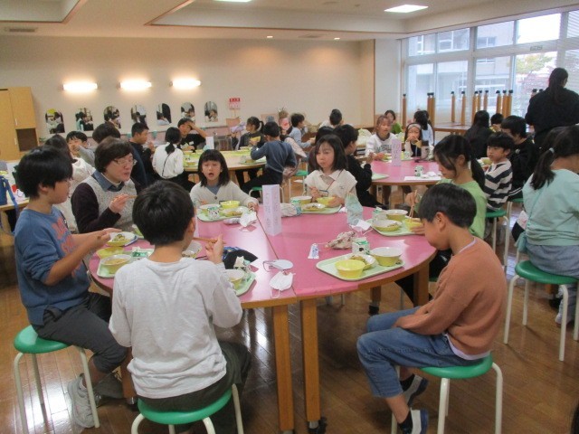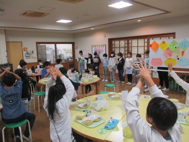 今日は4年生のランチルーム会食の日でした。宿泊学習の係ごとに分かれて会食を楽しみました。