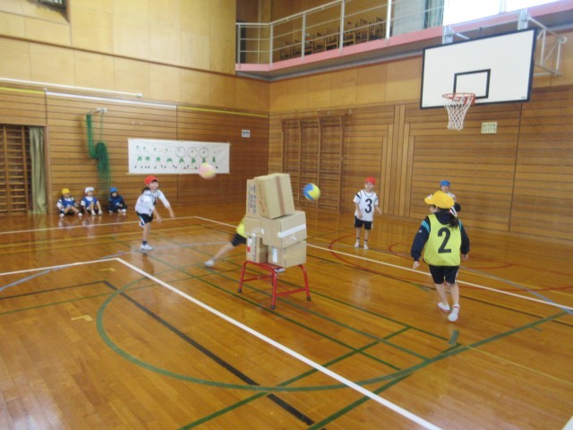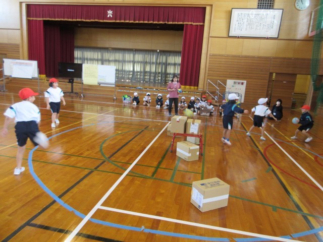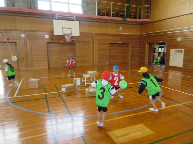 1年生は「投げて当てて楽しもう ボール投げゲーム」の学習に取り組みました。はじめにゲームのルールを確認し、試しのゲームを行いました。サークルの外から投げたボールを箱に当て、下に落とすことができたら得点します。得点が入るたびに歓声が上がっていました。
