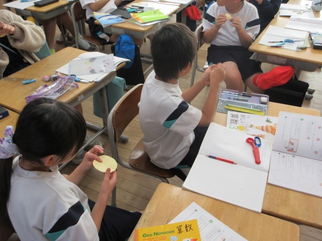 円の中心を見付ける学習に取り組みました。子供たちは円を折り曲げたり、ものさしで測ったりしながら中心点を見付けていました。