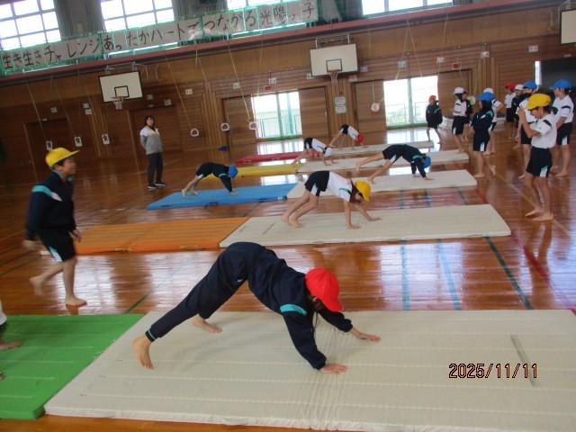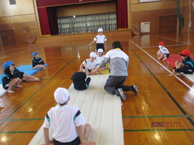 指導員の方に来ていただき、マット運動をしました。美しい後転や開脚技のポイントをたくさん教わりました。