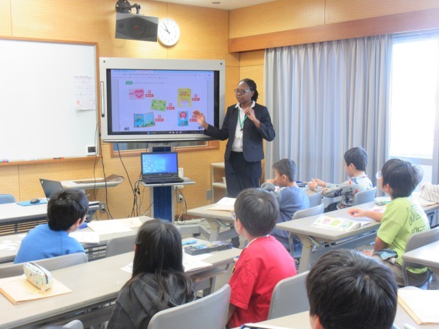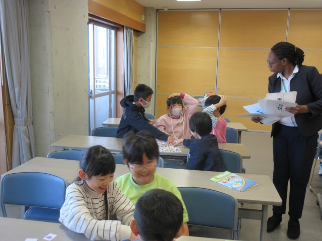 教師が提示した形・色のカードをとる、カルタをしました。楽しく活動し、英語に親しむことができました。