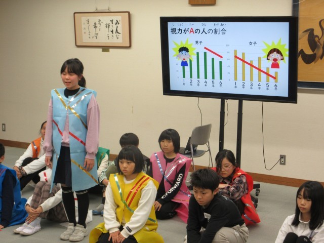 今日の5時間目に「目の健康を守ろう」をテーマにして学校保健委員会を行いました。児童保健委員会の子供たちは、高学年になるにつれて視力が下がっている人が多いことを紹介し、目の健康を守るために気を付けるとよいことを寸劇を交えて発表しました。また、学校医の山田先生からは、視力が下がる原因や、視力低下を防ぐくらし方について教えていただきました。