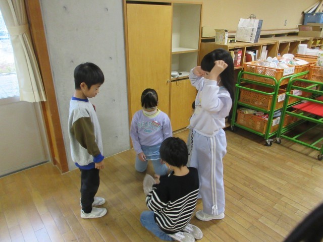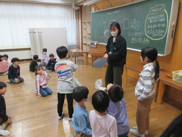 ゴムや風の力を利用して動くおもちゃ作りをします。今日はビニル袋を材料にして、どんな遊び方ができそうかお試しをしました。