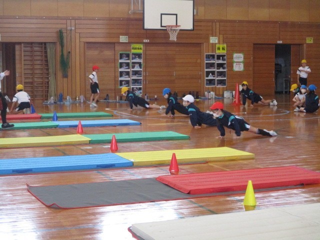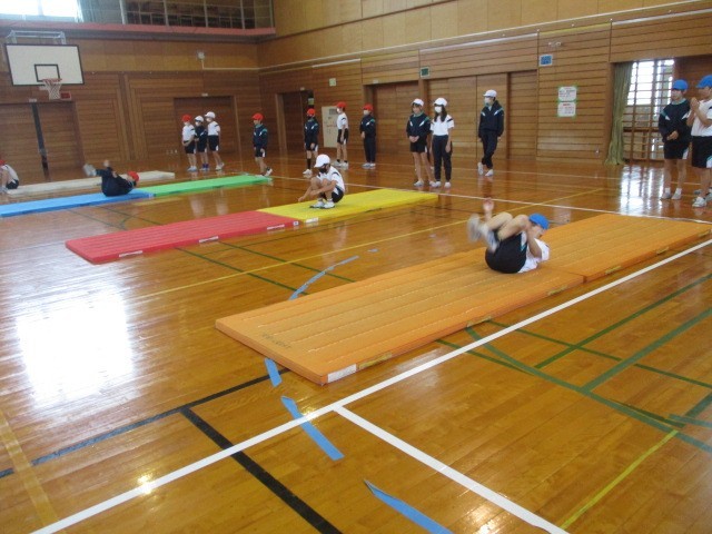 体育科の学習でマット運動に取り組みました。動物歩き、ゆりかご、前転等、昨年度の学習を思い出しながら基礎的な運動を行いました。