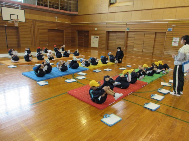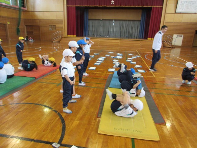 背中を丸めて、猫のように小さく丸くなってゆらゆらと転がる動き方を練習しました。頭がマットに付かないように転がるところが難しそうでした。