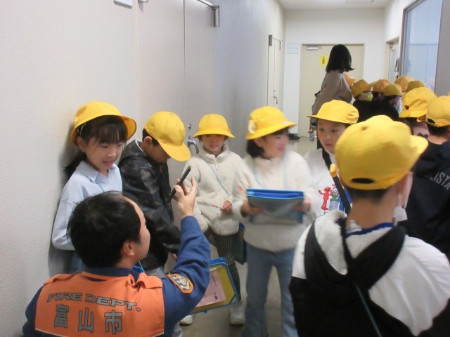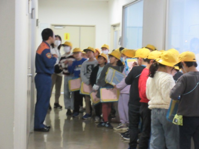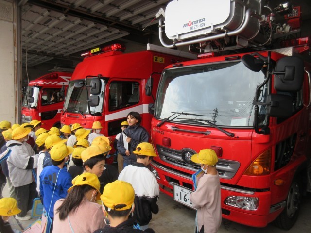 消防署では、学級ごとに分かれて、職員の方から話を聞いたり消防車の中を見せてもらったりしました。