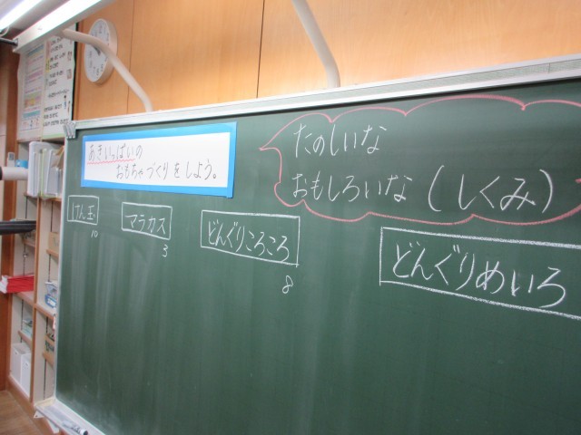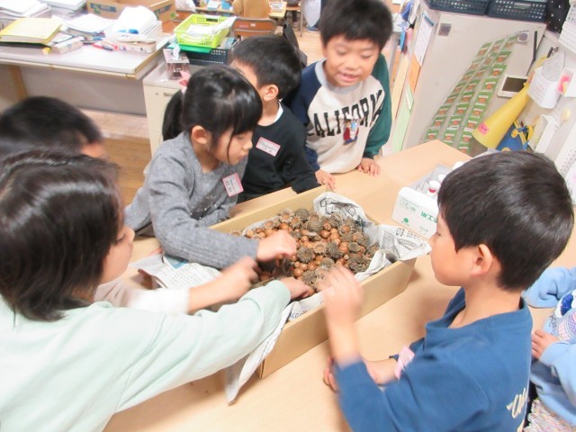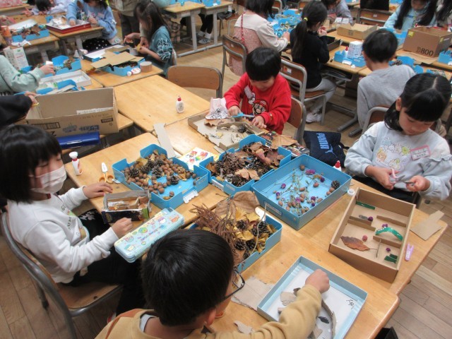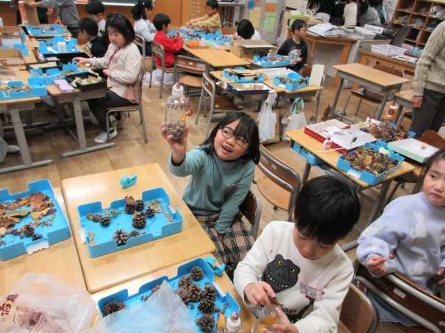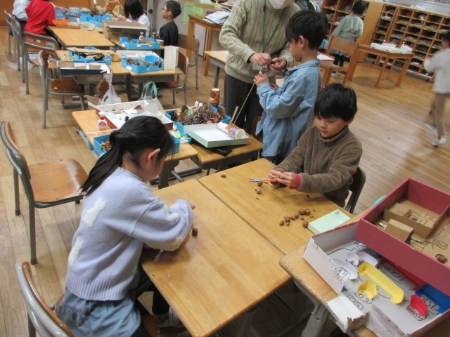 秋の身近な自然の材料を使っておもちゃ作りをしたり、遊んだりしました。みんなで集めたたくさんの材料を利用して、作る活動を楽しみました。