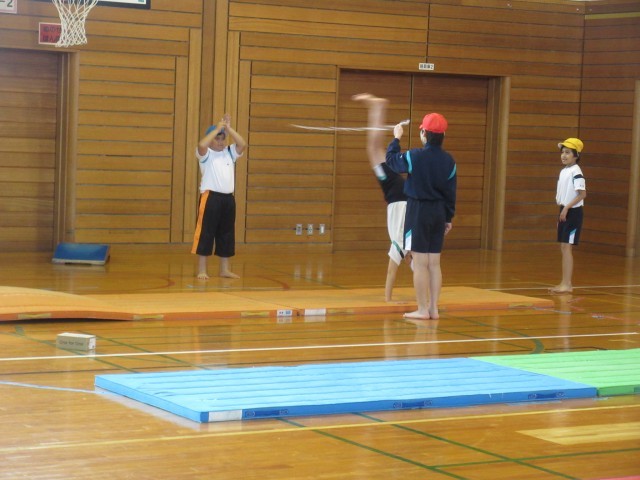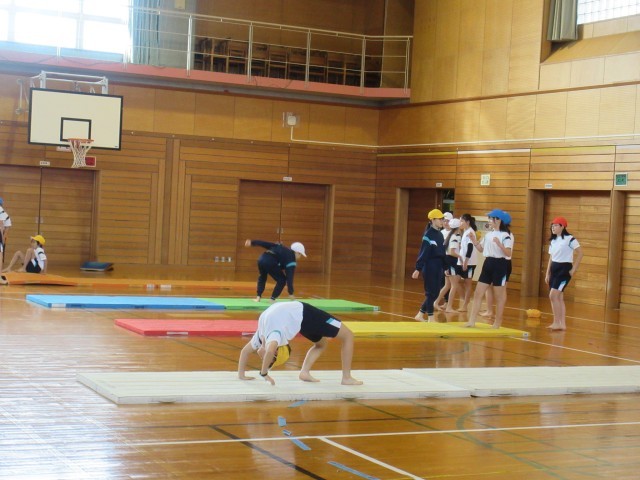 自分で場を選び、友達とアドバイスを送り合いながら練習しています。一人一人、目当てにしている技が美しくできるようになるとよいですね。