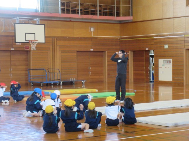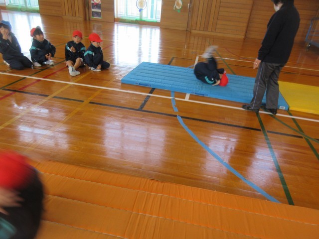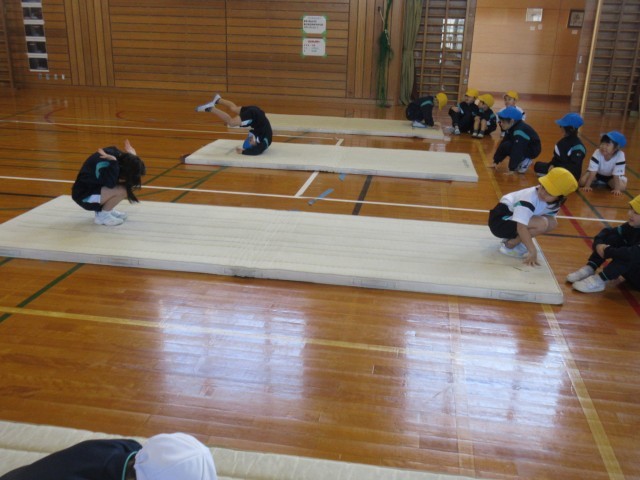 マットを使った運動遊びをしています。前向きや後ろ向きで回ることや、ブリッジ等、色々な動きが上手にできるようになってきました。