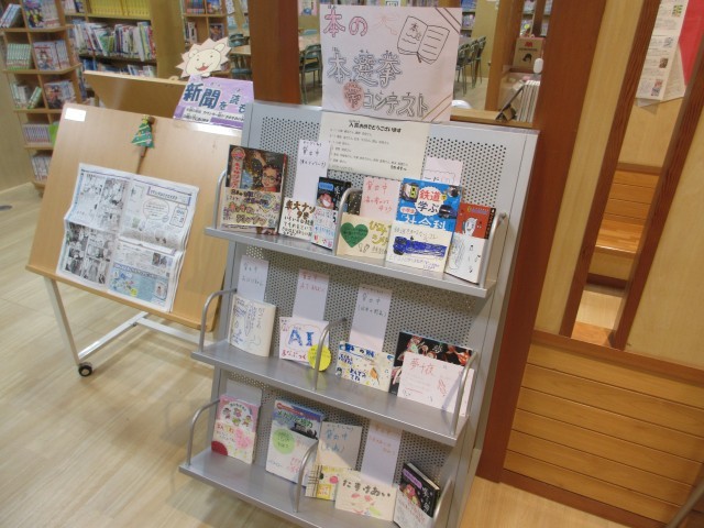 図書室に本の帯コンテストの紹介コーナーがあります。本の読者に「本の帯」を作ってもらい、その中から素敵なものを投票してもらいました。本の内容が分かりやすく紹介されているものがあり、とても素晴らしい企画です。