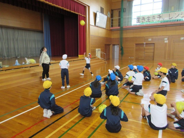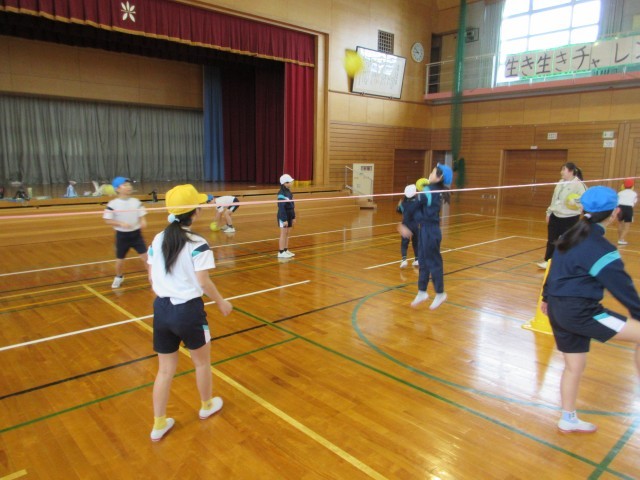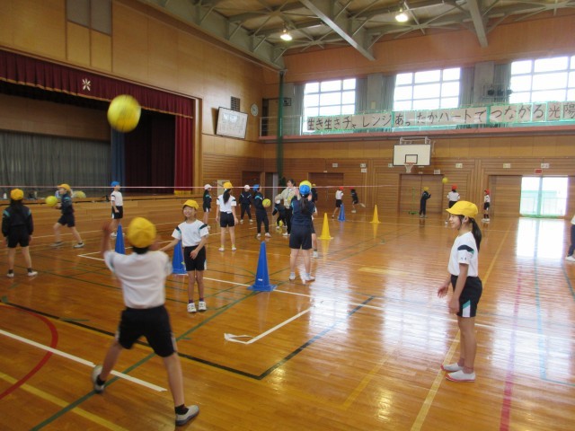 バレーボール型のゲームの練習を行いました。子供たちは味方同士でトスやレシーブをつないでから相手コートにボールを入れる練習に励みました。