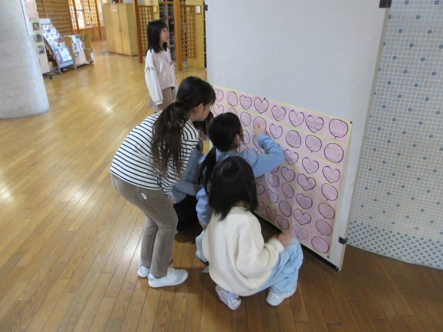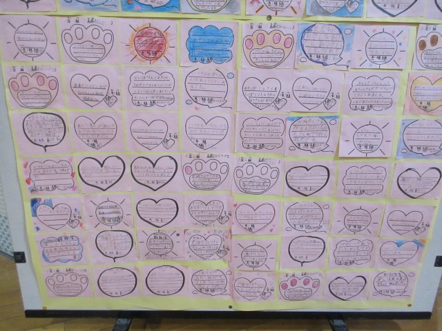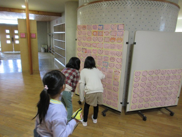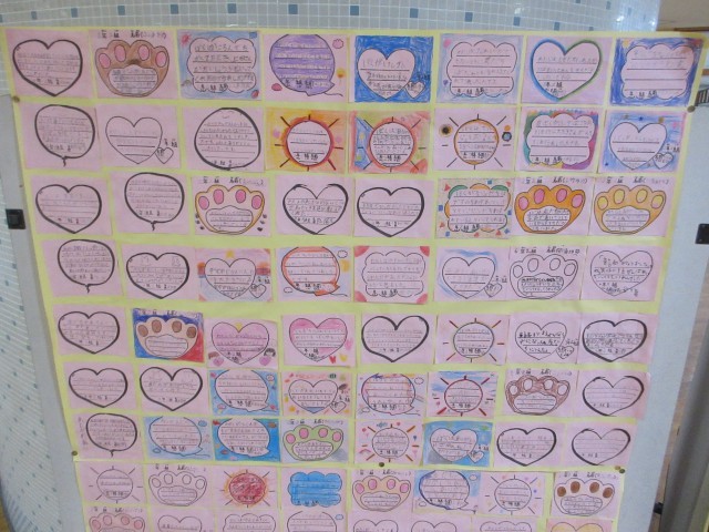 児童玄関近くの一角に、「あったかハートのメッセージ」が掲示されています。先日から職員室前にメッセージボックスが置いてあり、その中に投函されたものが掲示されました。友達にしてもらってうれしかったことや、友達のがんばりを認め励ますメッセージ等、心温まるものでした。