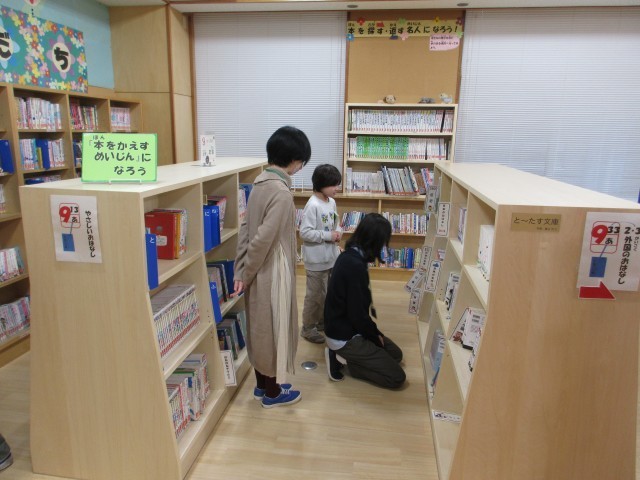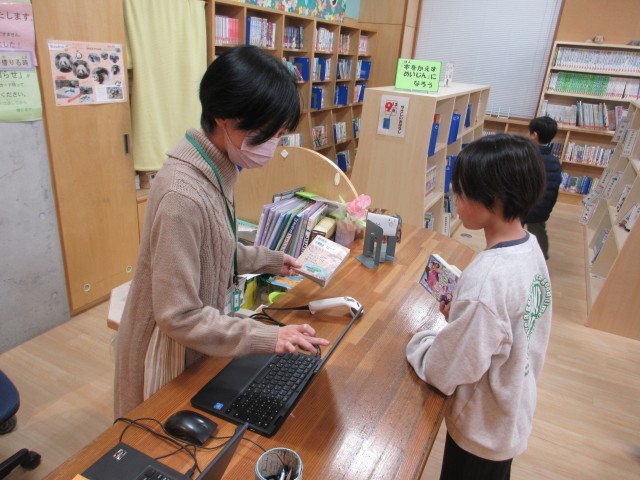 本を借りるために図書室を訪問しました。自分で読みたい本を選んだり、司書の先生にお勧めの本を聞いたりしていました。