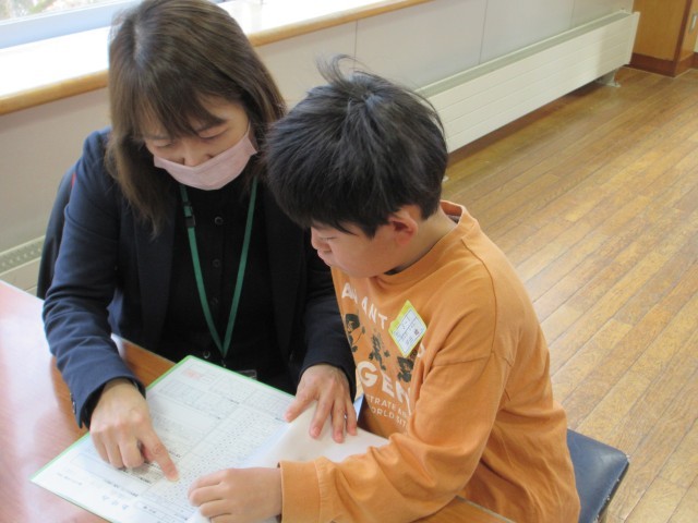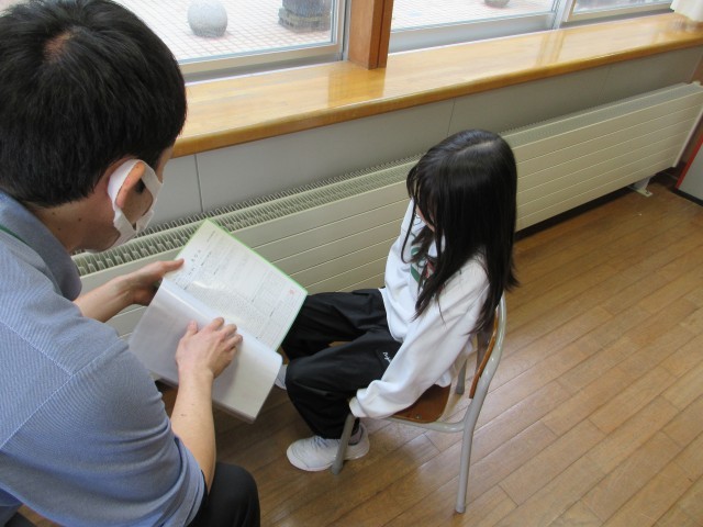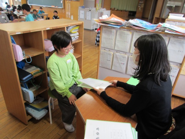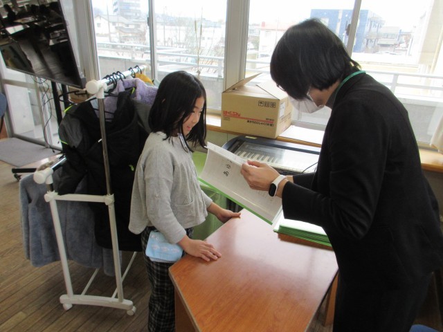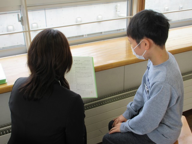 終業式が終わってから、教室で一人一人にあゆみが渡されました。担任は子供たちに「がんばっていたことや、すてきなところ」を伝えました。