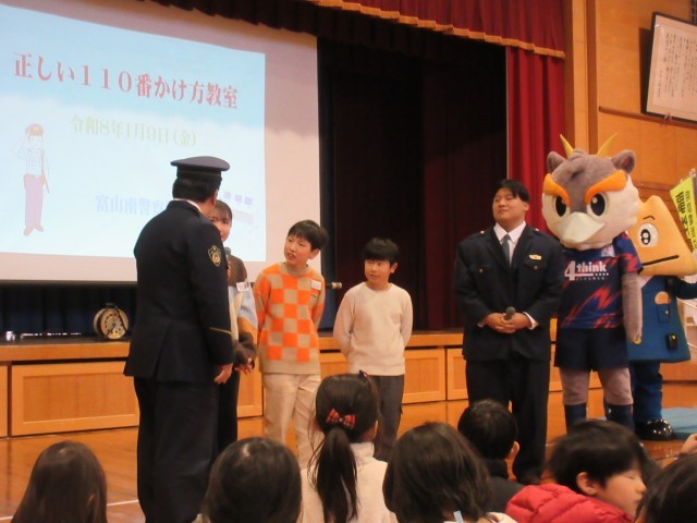 富山南警察署の方から、110番をかけるとどのように警察署の通信指令室につながるかや、正しい110番のかけ方等を教えていただきました。また、実際に不審者が侵入してきた想定で110番し、代表児童が通信指令室とライブ配信しながら不審者の特徴を伝える体験もしました。