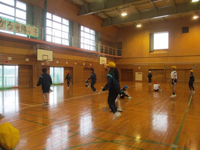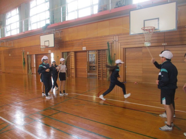 体育科の学習では、縄跳び運動に取り組んでいます。長縄跳びでは、団ごとに声をかけ合って、記録に挑戦していました。