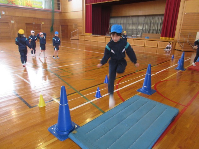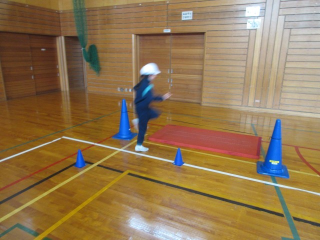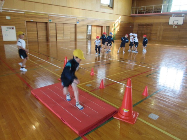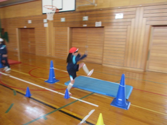 ゴム跳びをしました。助走は正面からではなく、斜め横の方から進み、片足ずつハサミのように足を動かす跳び方で運動しました。