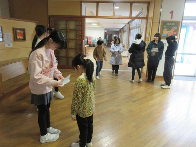運営委員会の子供たちが襷をかけて挨拶運動をしています。