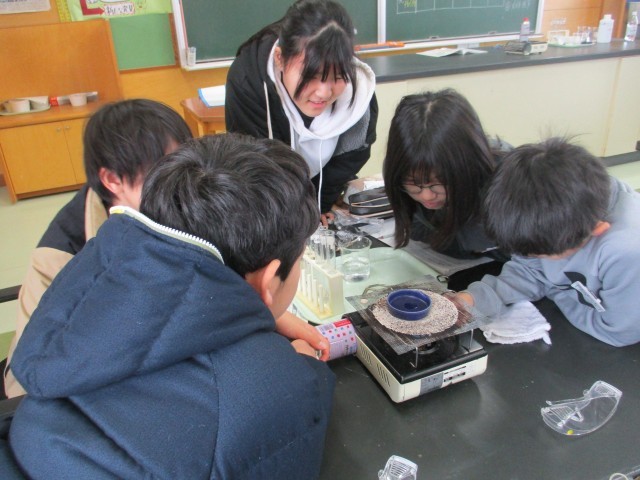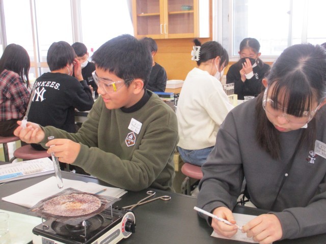 水溶液を蒸発させて、どのような違いがあるのかを調べています。正しく実験用具を使い、安全に実験しています!