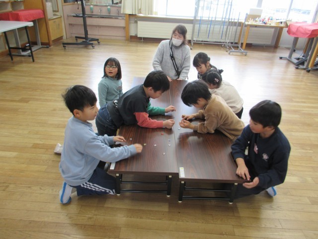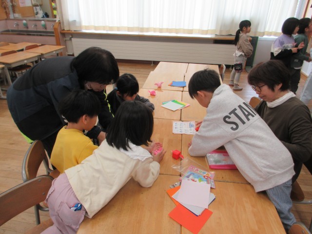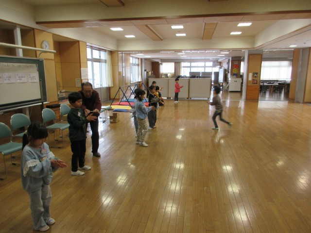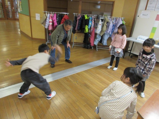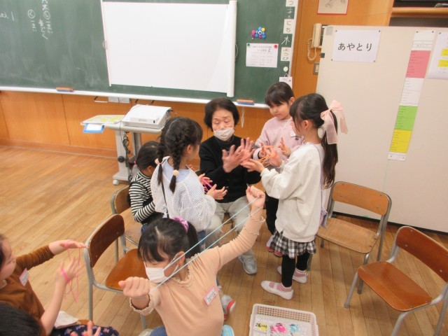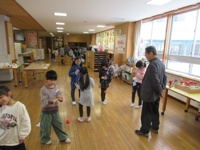 長寿会の方々と一緒に昔の遊びを楽しみました。あやとりやお手玉、けん玉、竹とんぼ等を名人さんたちに教えてもらいながら、昔の遊びのよさを感じ取っていました。