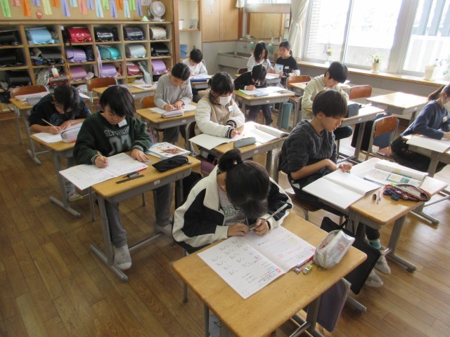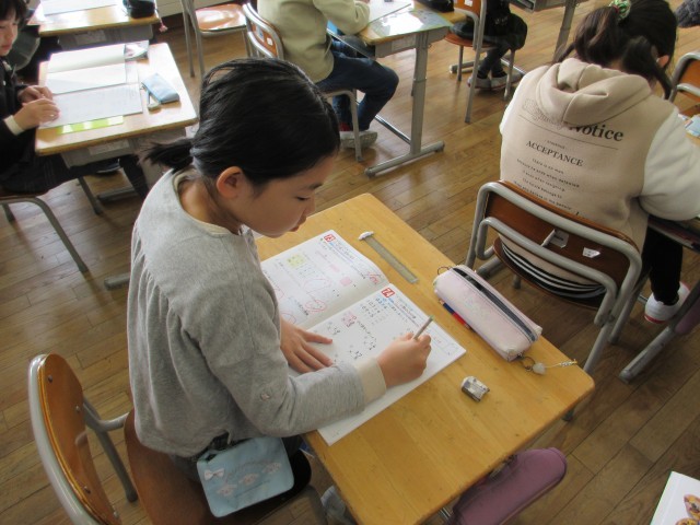 小数のかけ算の練習問題に取り組みました。小数点をどこに付けるか気を付けていました。