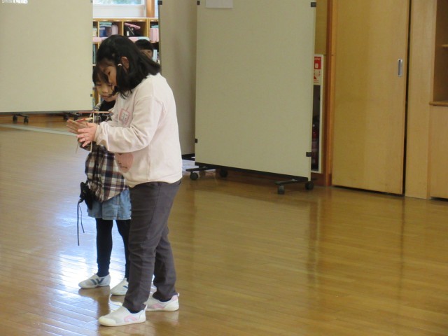 友達と教え合う姿があちらでもこちらでも見られます。「昔あそび名人」は、友達と仲よく遊ぶ名人でもあります。