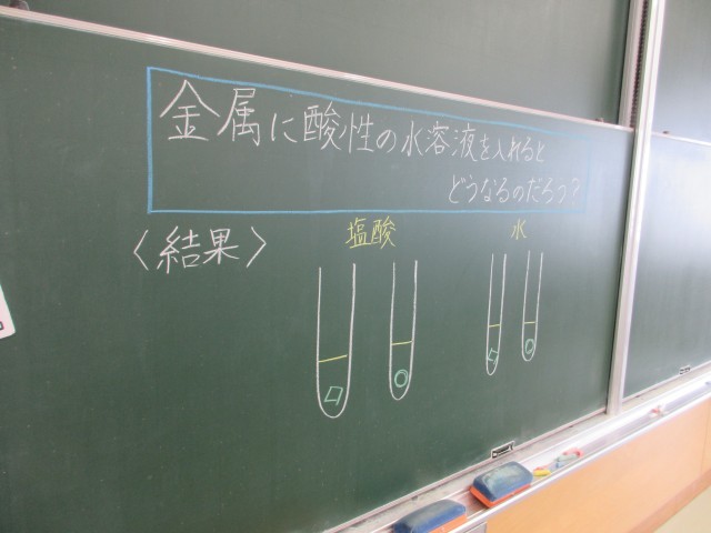鉄やアルミニウムなどの金属を水溶液を浸すと、どのような変化が起きるかを予想し、実験して確かめました。