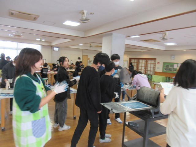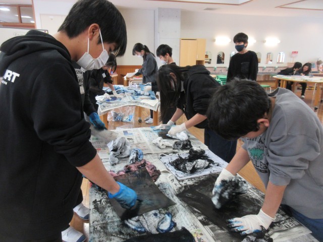 「ドライポイント」という技法で版画に取り組んできた6年生。今日は、講師をお招きし、刷りの作業を行いました。