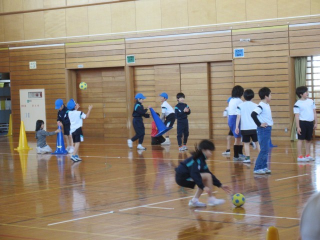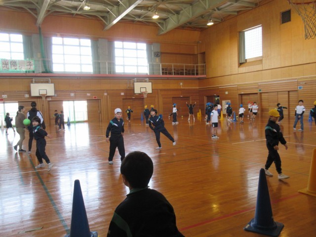 ハンドボールの学習をしています。今日は、ボールに慣れるために、パスをしたり的に当てたりしました。