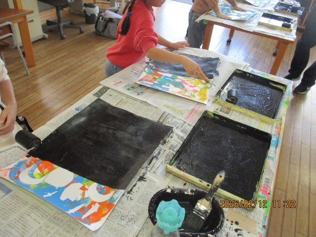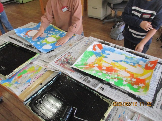 シールを貼った台紙に黒いインクをローラーで塗りました。真っ黒になる様子にドキドキしつつ、乾いた後にシールをはがすのを楽しみにしている子供たちです。