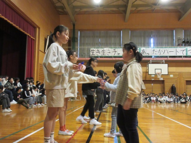6年生からのサプライズ。光陽の歴史クイズとプレゼントに、在校生は大喜びでした。