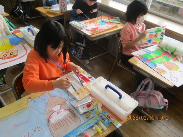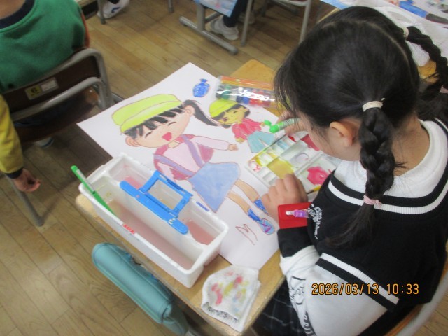 2年生最後の図画工作科では、2年生になってできるようになったことをテーマに絵を描いています。生活科で学習でしている「わたしたんけん」で振り返った自分の姿を一生懸命描きました。