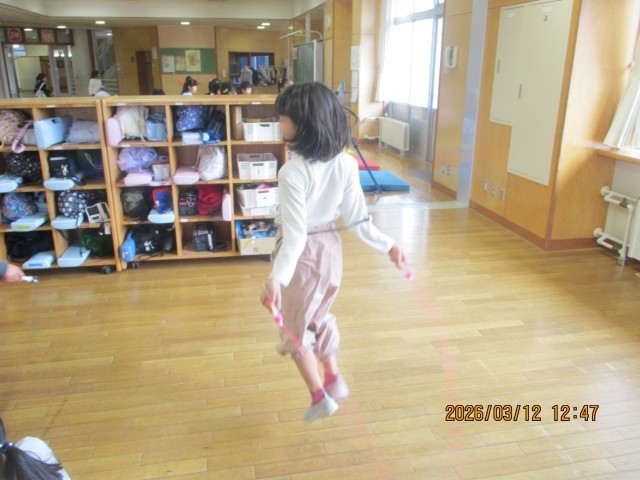 のびのびタイムの様子です。天気がいい日が増えてきたので、外で遊ぶ子供も増えました。毎日元気に遊んでいます。室内では、縄跳びや鉄棒、係活動等、おもいおもいの時間を過ごしています。